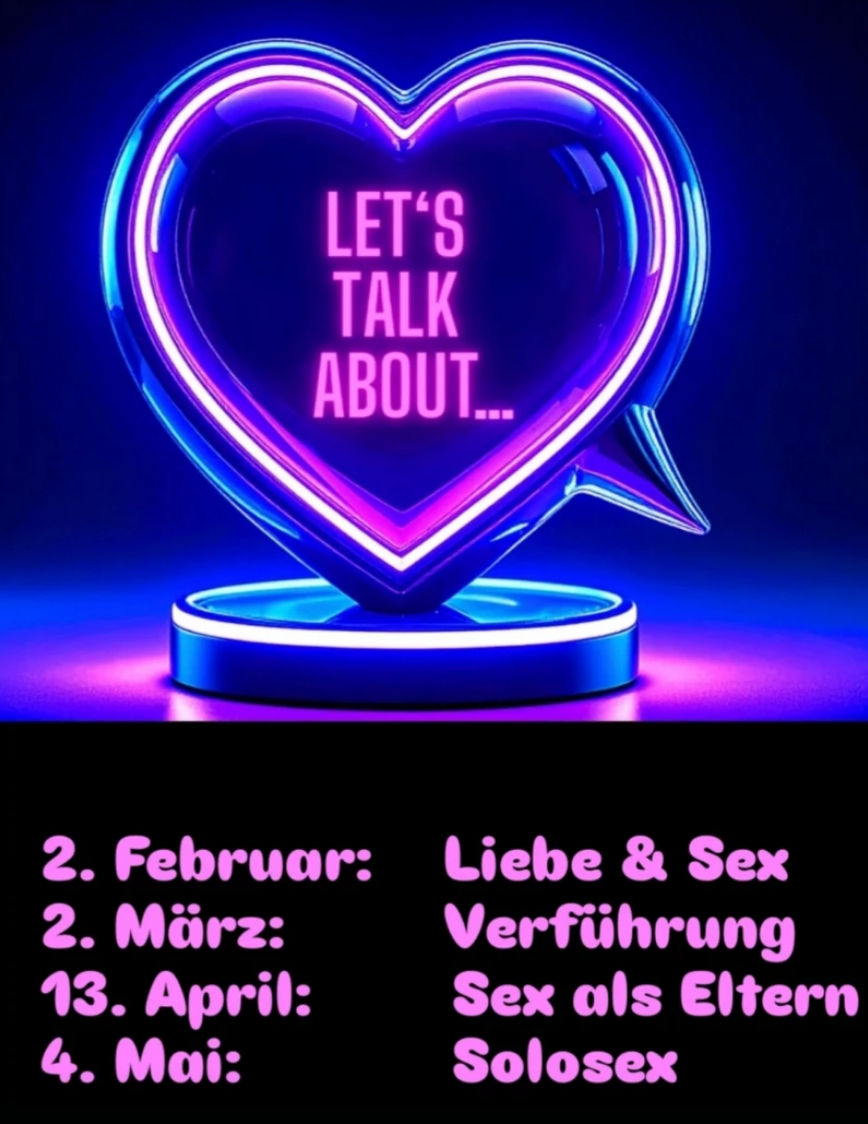 Nach einem kurzen Fachinput zum Thema lade ich dich herzlich zum offenen Gespräch ein. Komm allein, mit Freund:innen oder deiner:m Partner:in und tausch dich aus, lerne neue Perspektiven kennen und bring deine Gedanken mit. Gemeinsam reden wir über das worüber oft geschwiegen wird.